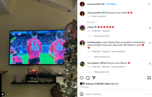 Rashford later took to Instagram to share a celebratory post following the game, seemingly expressing approval of his team's performance and victory. Alongside a picture of his TV showcasing the victorious team, Rashford captioned his post, "Yesssssssss! Love it lads." showing his support for the team even in his absence.
